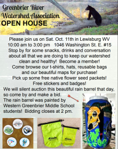 The Greenbrier River Watershed Association is hosting an OPEN HOUSE on Saturday, October 11th from 10:00 am – 3:00 pm.